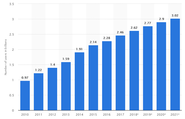 Technology is blooming day by day bringing a new breathtaking feature to the world. We are living in the era of technology, one who doesn’t follows this era will eventually lag behind. Communicating your customers through social websites and contemporary technology is what we call digital marketing.  Today, most of the people from infants to adults are using social media at every step of their life. Here is a report which shows the estimated number of social media users from 2010-2021.